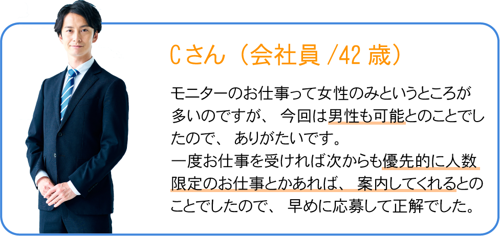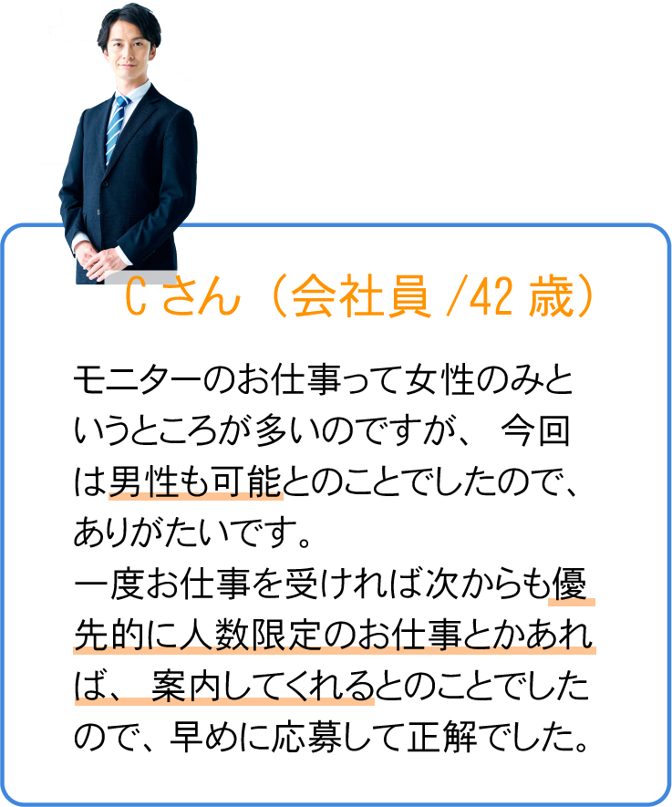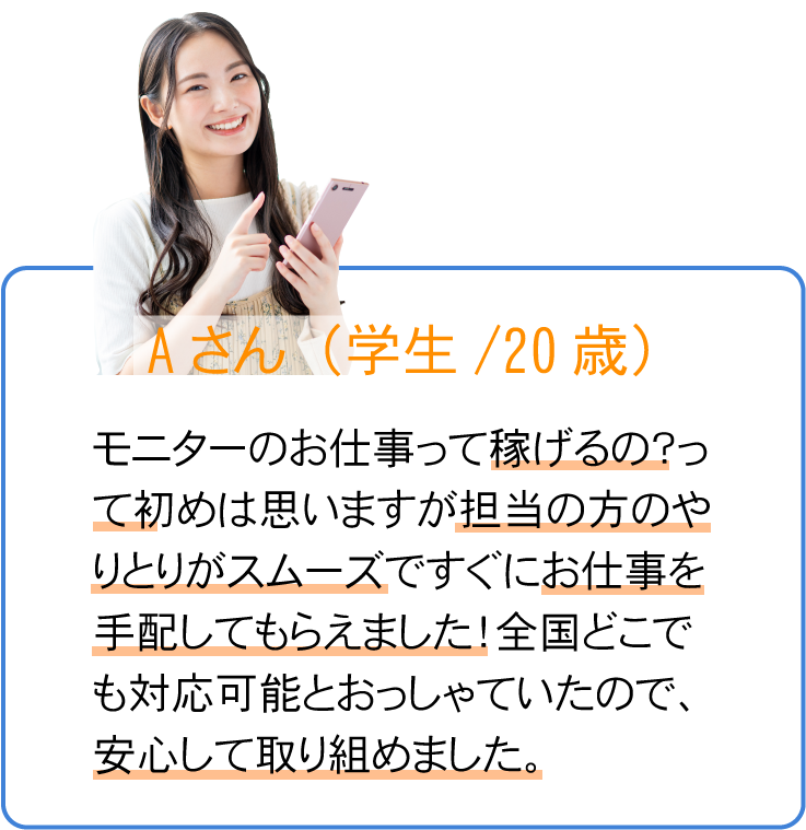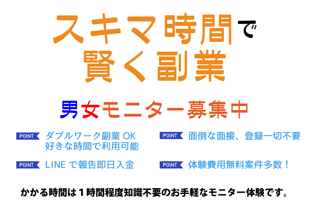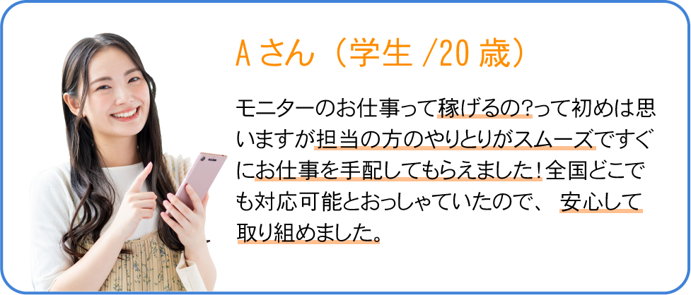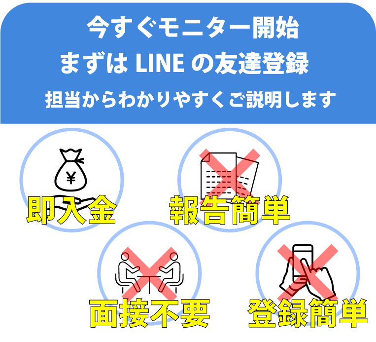 専門的な知識経験は一切不要で素直な意見を伝えるだけの簡単なモニター体験です。
